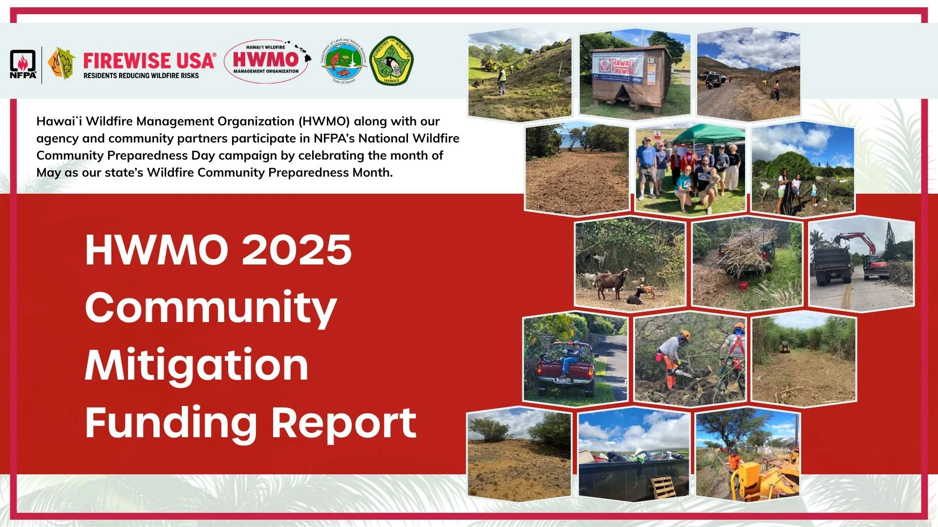 See how communities across Hawaiʻi are taking action to reduce wildfire risk through hands-on mitigation projects. This report highlights over 30 Firewise communities and their efforts to remove hazardous vegetation, create defensible space, and strengthen evacuation routes. With support from national and local partners, these projects are making our homes and neighborhoods safer. Download the full report to learn more and get inspired to take action in your area.